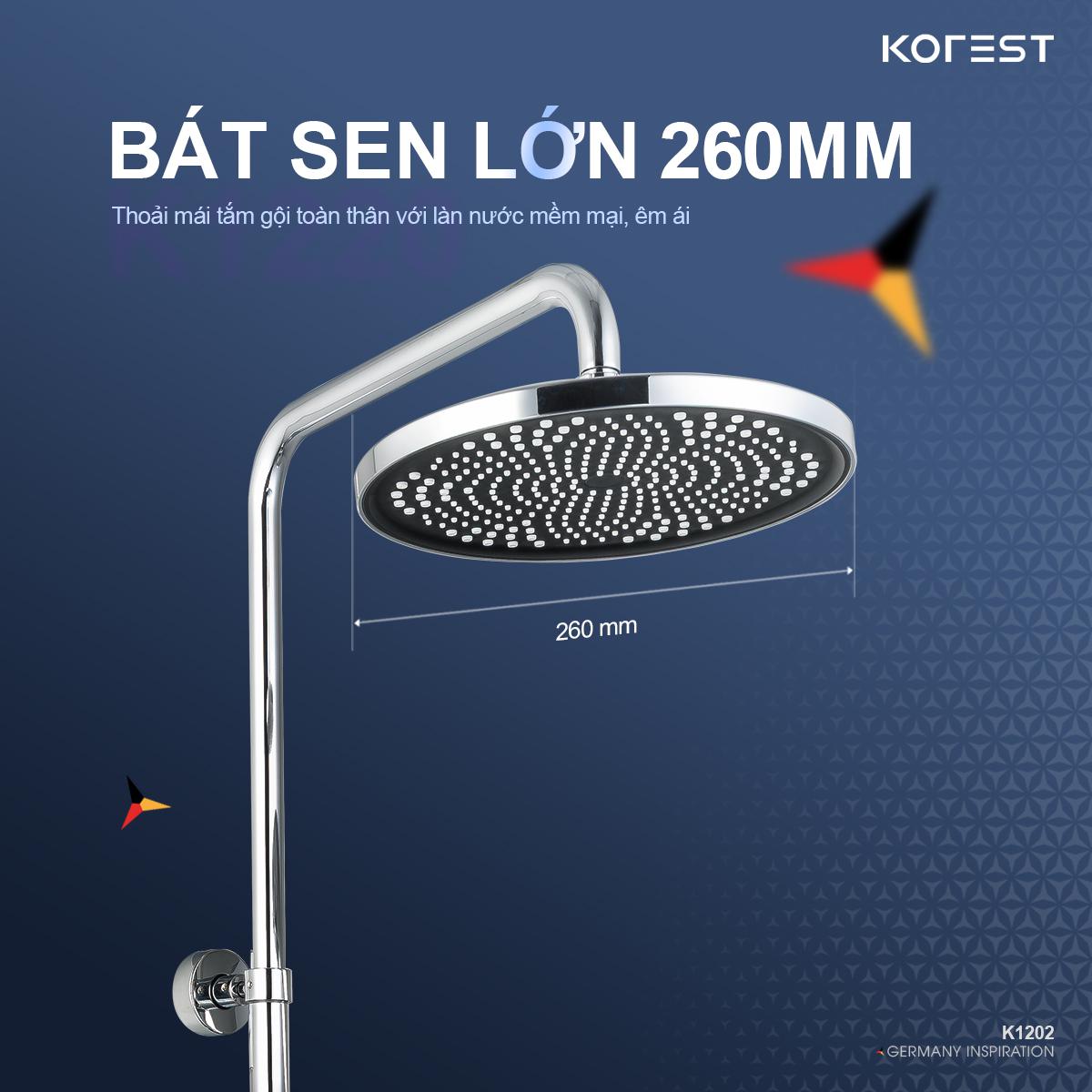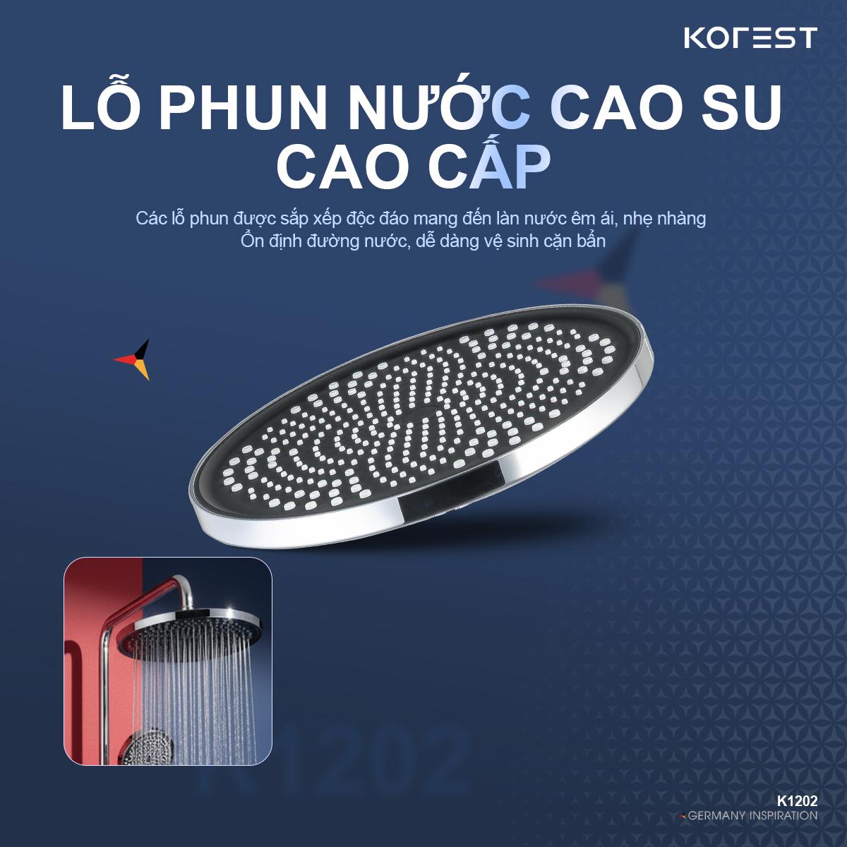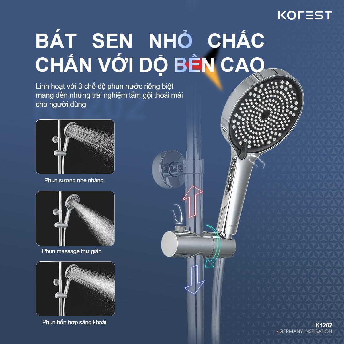K1202 sở hữu bát sen lớn 260mm cho dòng nước rộng bao phủ toàn thân, sen tay 3 chế độ linh hoạt từ phun sương nhẹ nhàng, massage thư giãn đến phun hỗn hợp mạnh mẽ, cùng vòi rửa ẩn thiết kế tinh gọn, tối ưu không gian và tiện lợi cho sinh hoạt hằng ngày. Chất liệu cao cấp khẳng định sự bền bỉ và an toàn: củ sen đồng nguyên sinh 59A đạt chuẩn 4MS Đức tuyệt đối an toàn cho sức khỏe, cần sen inox 304 chắc chắn, bát sen ABS nguyên sinh bền chắc, dây sen PVC dẻo dai chống xoắn, gia tăng tuổi thọ sử dụng.