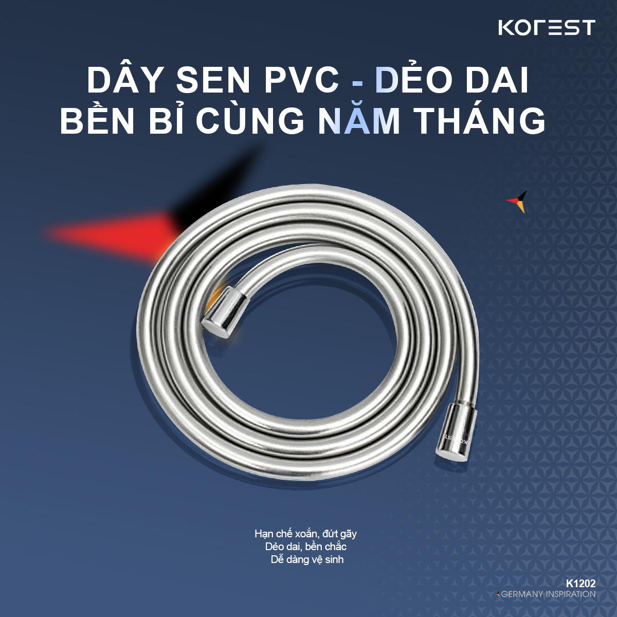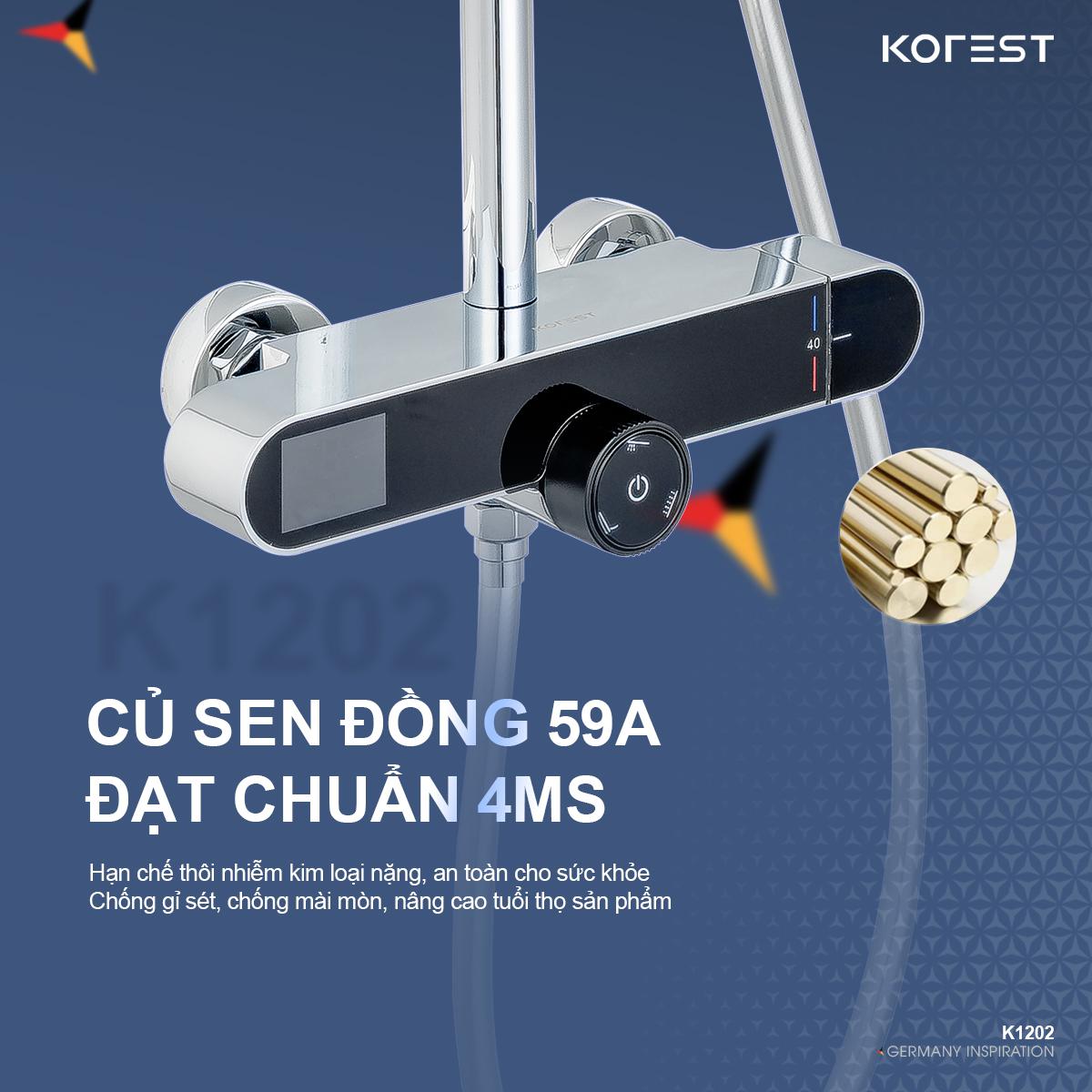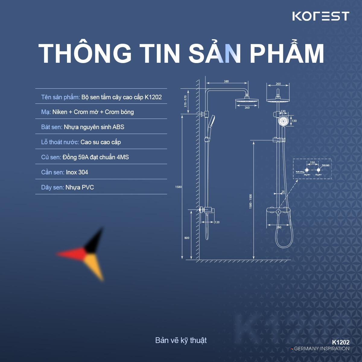 K1202 sở hữu bát sen lớn 260mm cho dòng nước rộng bao phủ toàn thân, sen tay 3 chế độ linh hoạt từ phun sương nhẹ nhàng, massage thư giãn đến phun hỗn hợp mạnh mẽ, cùng vòi rửa ẩn thiết kế tinh gọn, tối ưu không gian và tiện lợi cho sinh hoạt hằng ngày. Chất liệu cao cấp khẳng định sự bền bỉ và an toàn: củ sen đồng nguyên sinh 59A đạt chuẩn 4MS Đức tuyệt đối an toàn cho sức khỏe, cần sen inox 304 chắc chắn, bát sen ABS nguyên sinh bền chắc, dây sen PVC dẻo dai chống xoắn, gia tăng tuổi thọ sử dụng.