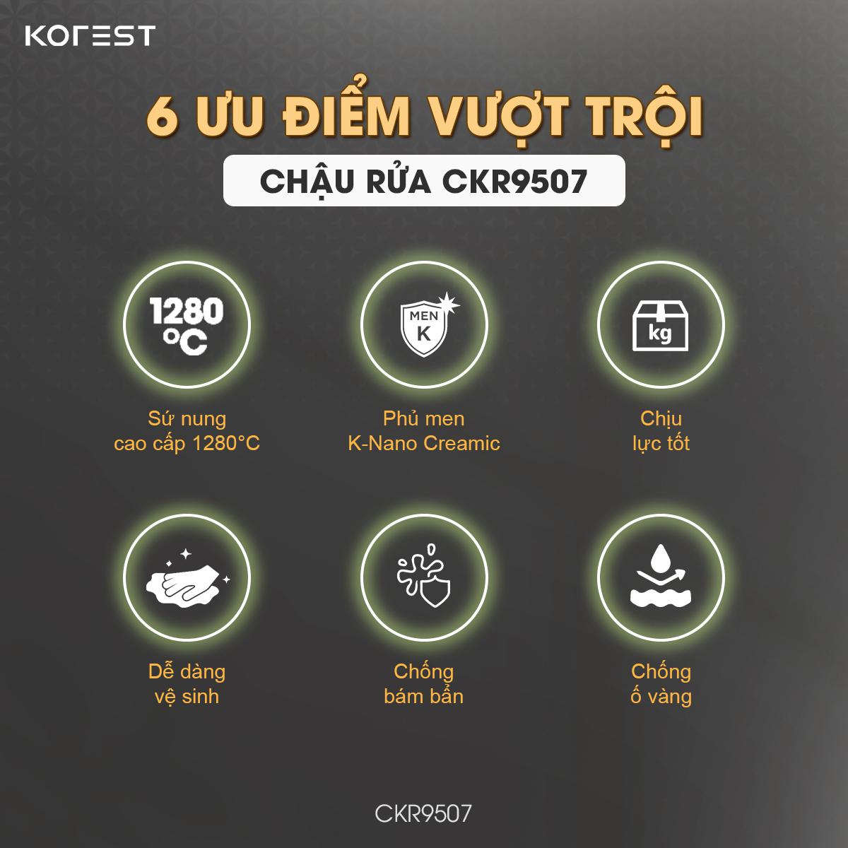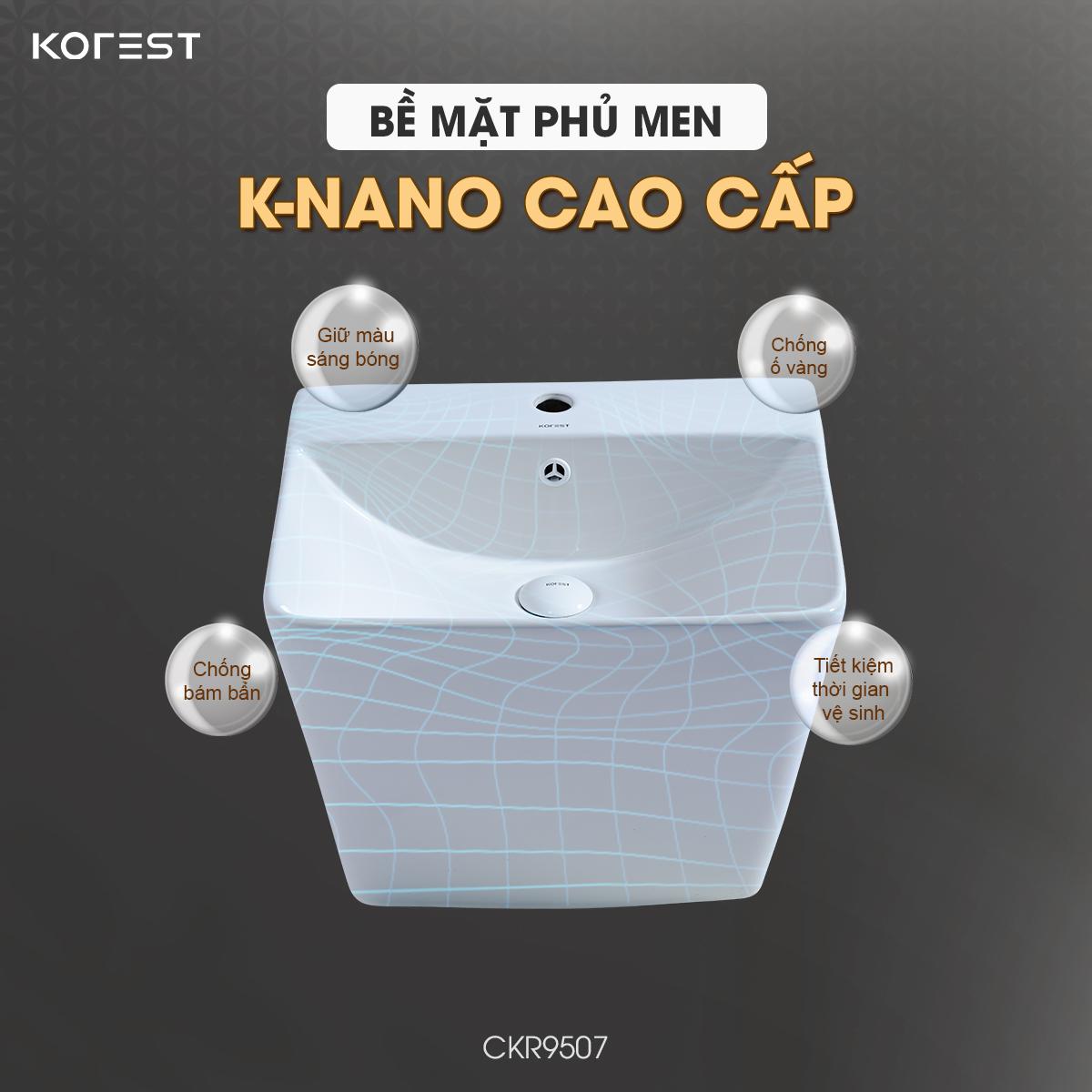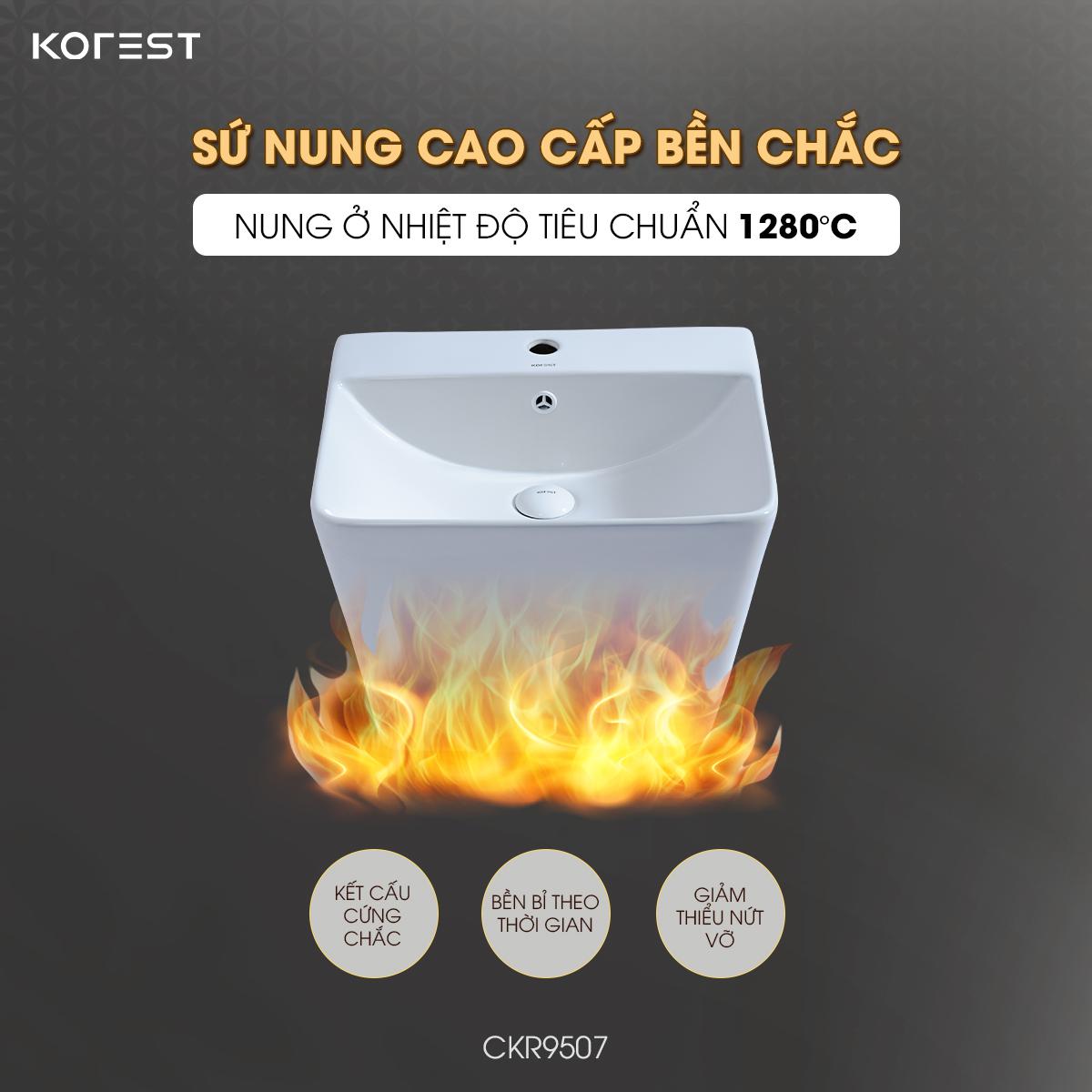 Với kích thước 505 × 410 × 390 mm, sản phẩm dễ dàng phù hợp với nhiều diện tích khác nhau, từ căn hộ hiện đại đến biệt thự cao cấp. Được chế tác từ sứ cao cấp nung ở 1280°C, CKR9507 sở hữu kết cấu bền chắc, chịu lực vượt trội và hạn chế nứt vỡ. Lớp men K-Nano kháng khuẩn phủ bề mặt mang lại độ sáng bóng lâu dài, chống ố vàng, hạn chế bám bẩn và dễ dàng vệ sinh, giúp chậu luôn giữ được vẻ đẹp như mới.
